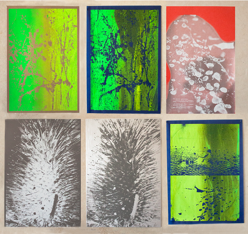 Dans un second temps, nous avons réalisé des sérigraphies à partir de photos que nous avions prises de textures et de formes issues du vivant qui dialoguent avec ce rapport entre nature et toxicité. Nous avons également imprimé sur tissus la limace marine Elysia Chlorotica — capable de photosynthèse grâce à son alimentation à base d’algues — a donné son nom au projet. Ce médium nous a permis de questionner plastiquement cette ambivalence entre vitalité et poison avec des contrastes entre des couleurs fluo, des encres phosphorescentes, très artificielles et des tons plus naturels.