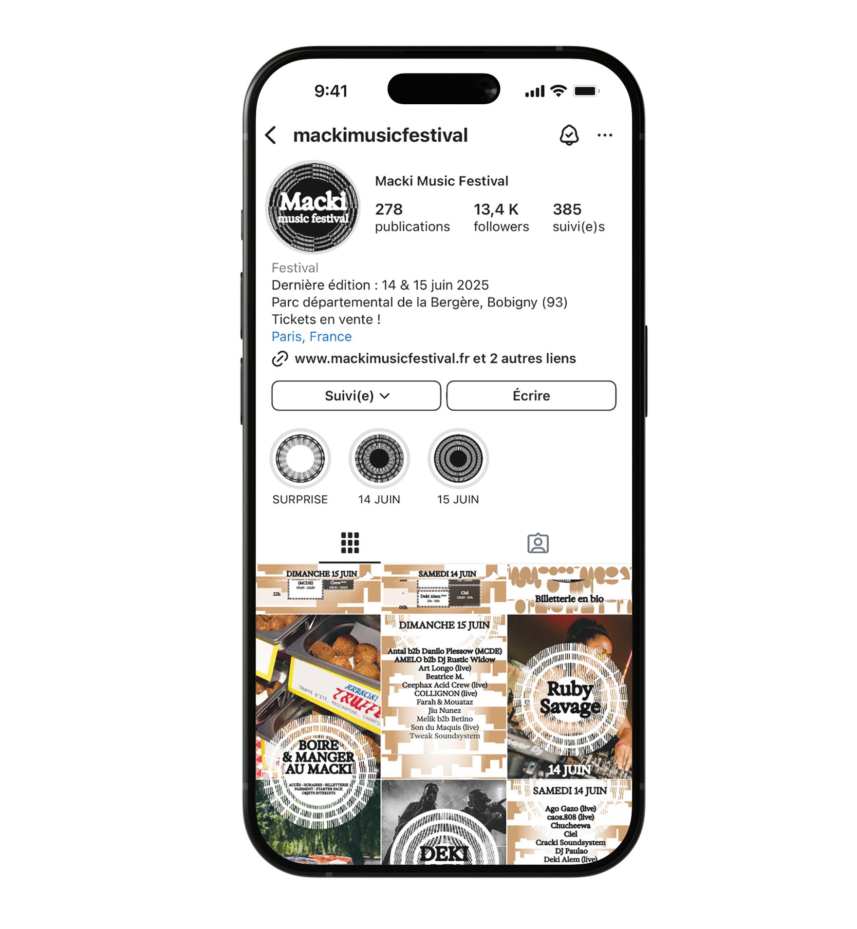 La communication numérique se veut assez minimale, un site internet d’une page, sans images, avec un lien vers la billeterie en ligne, des noms de la programmation révélés au passage de la souris, pour reprendre le système de l’affiche. Sur la page Instagram, le système de formes tramées se décline pour annoncer les différentes infos pratiques et la programmation.